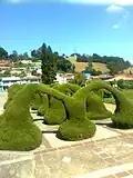 Entre las figuras destacan una avenida con arcos de ciprés que conduce hasta la iglesia, así como figuras de caras de indios, un elefante, avionetas, helicópteros, boxeadores, un pulpo, un redondel, bailarinas, gallinas y un dinosaurio.