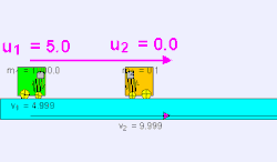 Ejemplo de colisión elástica (m1 = 1000 kg, u1 = 5 m/s, m2 = 0,1 kg, u2 = 0 m/s) de un objeto muy pesado contra otro muy ligero; existe una pequeña transferencia de momento al más ligero que sale disparado a mayor velocidad, mientras que el primer cuerpo apenas sufre una ligera deceleración v1 = 4,999 m/s, v2 = 9,999 m/s.