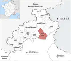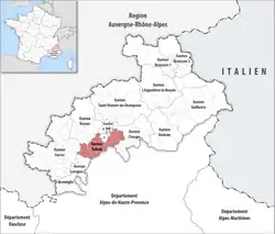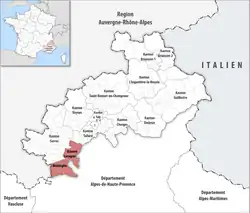 - ↑ a b Decreto nº 2014-193 de 20 de febrero de 2014 donde se especifica la nueva distribución cantonal del departamento de Altos Alpes. Consultado el 4 de julio de 2017