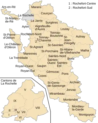 - Distrito de La Rochelle[2] (15 cantones - prefectura: La Rochelle):