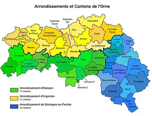 - Distrito de Mortagne-au-Perche[3] (12 cantones - subprefectura: Mortagne-au-Perche):