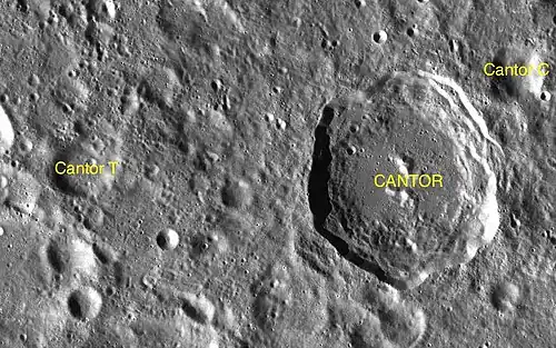 El terreno circundante de Cantor está fuertemente impactado por muchos cráteres pequeños. El antiguo cráter H. G. Wells, fuertemente erosionado, aparece al noroeste. Al sureste se sitúa Kidinnu.