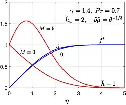 Las expresiones comúnmente utilizadas para el aire son . Si es constante, entonces . La temperatura dentro de la capa límite aumentará aunque la temperatura de la placa se mantenga a la misma temperatura que la ambiente, debido al calentamiento disipativo y, por supuesto, estos efectos de disipación sólo son pronunciados cuando el número de Mach es grande.