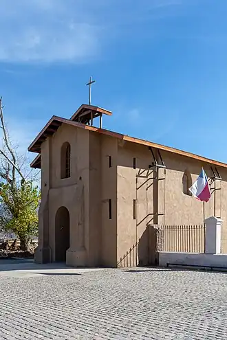 El templo es la construcción más alta del conjunto arquitectónico. Sus muros son de adobe, y cuenta con un acceso y una nave interior. Sobre el acceso se ubica el coro de la capilla, que sirve también como mirador. El edificio es una de las pocas construcciones que dan cuenta de la existencia previa de una hacienda en el sector.[1]