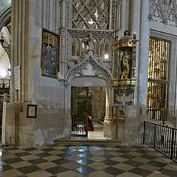 La capilla tiene acceso directo al falso crucero mediante un arco triunfal cuyo intradós está muy decorado con arcos polilobulados con caireles de tradición árabe. En las enjutas destacan dos esculturas junto a los escudos del obispo Rojas. La de la derecha representa al promotor de la obra y la de la izquierda al canónigo Pedro Estébanez de Alcántara.[1] El arco está cerrado casi hasta la mitad por una gran reja de dos cuerpos, adornada con flores de lis, símbolo del obispo fray Alonso de Burgos y rematada por un crucifijo y el escudo de dicho obispo. Sobre el arco se extiende un frontal con arquería y estatuas bajo doseletes: en el centro la Virgen con el Niño y a los lados san Pedro, san Andrés, san Antolín y dos diáconos. Todas estas esculturas, de estilo Gótico, se atribuyen a un maestro francés de principios del siglo XV.[2]