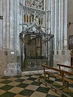 La otra reja que da al falso crucero es la entrada principal de la capilla. Es un trabajo atribuido al rejero salmantino Luis de Paredes. En su crestería se ven los escudos del cabildo y del mecenas fray Alonso de Burgos. Está compuesta por dos cuerpos y tres calles separadas por pilares poligonales. Se remata en el centro con un arco trilobulado que sostiene dos escudos, el del Cabildo y el de fray Antonio de Burgos.[11]