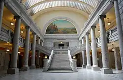 Flanqueando los lados este y oeste de la rotonda se encuentran los atrios, que contienen grandes tragaluces que permiten que la luz solar ingrese a las áreas públicas. Alrededor de los atrios hay dos niveles de balcones que se apoyan en veinticuatro columnas monolíticas de estilo jónico.[16] Al final de cada atrio hay una escalera de mármol y un mural. El mural arqueado en el extremo oeste, sobre la entrada a la Cámara de la Cámara, se titula El Paso de los Carros, mientras que el mural en el extremo este, sobre la entrada de la Corte Suprema, se conoce como la Virgen del Carro. Ambos murales fueron un tributo a los primeros pioneros y fueron las primeras obras de arte encargadas en el capitolio, firmadas por Girard Hale y Gilbert White.[17]