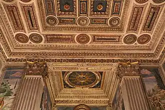 El pavimento imita los vivos colores y detalles de los frescos. El artesonado y la carpintería son diseño de Giuliano da Sangallo.