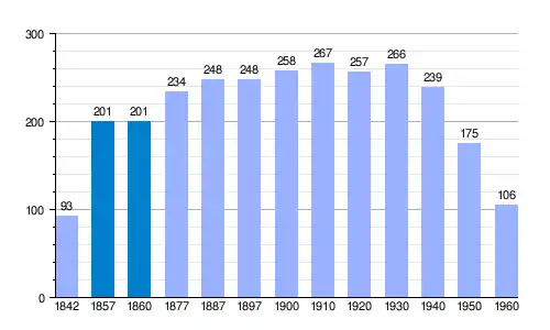 | Gráfica de evolución demográfica de Carabias[2] entre 1842 y 1960 |
