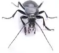 El escarabajo de tierra violeta es un escarabajo negro poco brillante que tiene bordes violetas o índigo en sus élitros ovalados y lisos (cubiertas de las alas) y tórax.[2] Los escarabajos adultos suelen medir entre 20 y 30 mm (0,8 y 1,2 pulgadas),[2] aunque pueden alcanzar los 37 mm.[2] Los escarabajos adultos no vuelan.[2]
