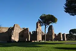 Las termas de Caracalla comenzaron a construirse en el año 211, al inicio del gobierno de este emperador, aunque lo más probable es que su padre fuera el responsable de su planificación. En el año 216 fueron inauguradas parcialmente, pero su perímetro exterior no se completó hasta el reinado de Alejandro Severo.[34]