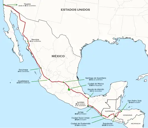 La mayor parte de la caravana migrante partió rumbo a Irapuato (Guanajuato), llegando entre el 11 y 12 de noviembre;[46] para después partir rumbo a Guadalajara (Estado de Jalisco), donde pasaron la noche del 12 y 13 de noviembre.[47] También el 12 de noviembre un primer grupo de 75 personas llegó Tijuana, la mayoría integrantes de la comunidad LGBT,[48] y el 13 de noviembre un segundo grupo de 350 personas también llegó a la ciudad;[49] ambos grupos se adelantaron al contingente principal. El gobierno de Jalisco dispuso buses para los miembros del grueso de la caravana, quienes fueron llevados a Ixtlán del Río (Nayarit), y de allí al municipio de Escuinapa (Sinaloa), llegando la noche del 14 de noviembre. Desde allí tomaron otros autobuses que condujeron toda la noche hasta Navojoa (Sonora), para finalmente llegar a Tijuana (Baja California) el 16 de noviembre.[50] Los días posteriores el resto de la caravana continuó agrupándose en Tijuana,[51] llenando el albergue Benito Juárez con hasta 5 mil personas.
