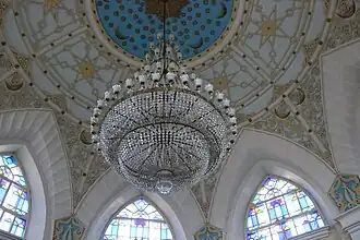 La esfera de la cúpula está dividida en altura por dos líneas horizontales que se ejecutan en anillos en tres partes. La parte superior está hecha en forma de cielo: en el centro, sobre un fondo azul, hay un sol brillante rodeado de ocho medias lunas y muchas estrellas de seis puntas. La parte central está dividida en ocho partes iguales por varillas que se extienden en dirección radial desde el eje de las pilastras. En el centro de cada uno de los campos así formados, decorados con los mismos patrones de estuco, se coloca una estrella de ocho puntas. En la parte inferior de la cúpula hay ventanas arqueadas, el piso entre las cuales está lleno de arabescos convexos y complejos adornos bahkir. Una lámpara de araña de cristal dorado está suspendida en el centro de la cúpula de la mezquita.[12]