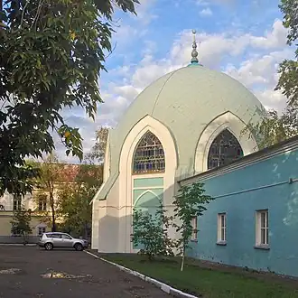La altura de la mezquita desde la base hasta la parte superior de la cúpula es de 18,9 m.[11] La parte inferior de la cúpula tiene forma esférica y la parte superior es ligeramente cónica, hay una pequeña aguja adornada con una media luna. Los soportes de la cúpula son arcos de lancetas de ventanas que transmiten presión desde la cúpula a las paredes en las esquinas del edificio, que están reforzadas desde el exterior con contrafuertes de sección transversal rectangular, formando una única unidad monolítica con las paredes. Estos contrafuertes se ven en la fachada como columnas unidas cubiertas con un solo techo inclinado.[12]