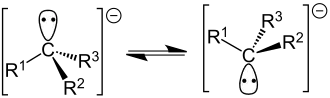 En el carbanión, el átomo de carbono posee un par de electrones sin compartir y soporta una carga negativa, junto además n sustituyentes para totalizar 8 electrones de valencia. En el caso de tres sustituyentes (n=3), caso típico, su geometría es de pirámide trigonal (como la del amoníaco).