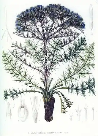 - ↑ a b c Susanna A. & García-Jacas N., Cardueae en Kadereit, J.W. & Jeffrey, C. (Eds.), The Families and Genera of Vascular Plants, Vol. VIII - Asterales, pag. 123-147; Kubitzki, K. (series ed.): The Families and genera of vascular plants, Springer, Heidelberg, 2007