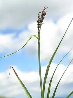 Esta juncia produce tallos de hasta 50 centímetros de altura, que crece en una mata o por solitaria. Las hojas son de color verde oscuro y rígidas, y las hojas de las temporadas anteriores pueden permanecer en la planta. La inflorescencia es acompañada por una corta bráctea y tiene de 1 a 3 espigas negras pistiladas y de 1 o 2 estaminadas.[1] La planta generalmente se reproduce vegetativamente , brotando retoños de su rizoma. También se propaga a través de estolones.[1] Tiene una red de raíz gruesa que le permite formar un césped y las raíces pueden crecer los 80 cm de profundidad en el suelo.[3] La planta, a veces, se reproduce sexualmente, produciendo semillas. Las semillas pueden permanecer viables durante 200 años.[1]