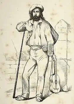 Un género separado que podría no encajar completamente en la rúbrica de la literatura es una avalancha de rimas de origen en su mayoría popular y rural, que se mantuvieron vivas a veces durante generaciones cuando se transmitieron en la tradición oral; entraron en la literatura solo cuando los eruditos posteriores los pusieron por escrito, ya fueran etnógrafos o historiadores. Dos de estas antologías carlistas están disponibles para rimas en castellano y en euskera;[48] ambos demuestran un apoyo abrumador hacia la causa carlista entre la gente rural, aunque principalmente entre los vascos. Entre los autores (o coautores) mayoritariamente anónimos aunque a veces identificados, destaca sin duda José María Iparraguirre, el versolari carlista más conocido, autor (o coautor) de quizás los versos vascos más célebres, Gernikako arbola, por algunos considerado la icónica encarnación poética genuina del carlismo.[49] Otros apuntan hacia Vicenta Moguel, carlista y autora de poemas tradicionalistas en euskera.[50] Por el lado catalán, hay que señalar Lo cant de las veritats (1857) de autor anónimo y hasta ahora no identificado; representa probablemente el primer caso de tema carlista reconocido en la literatura popular catalana y es una mezcla de sentimentalismo romántico, didáctica filosófica y relato de aventuras, mitad prosaico y mitad en rima.[51]