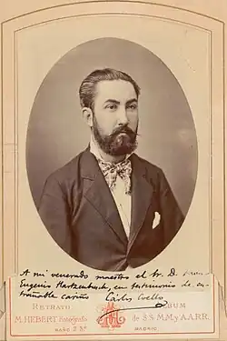 ![]() Carlos Coello de Portugal, fotografía de M. de Hebert. Dedicatoria manuscrita: «A mi venerado maestro el Sr. D. Juan Eugenio de Hartzenbusch en testimonio de entrañable cariño. Carlos Coello». Biblioteca Nacional de España | ||