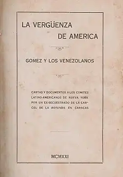En 1921, desde su exilio en Nueva York, publicó bajo la autoría anónima de "un ex-secuestrado de la cárcel de La Rotunda de Caracas", un libro llamado "La Vergüenza de América". El libro denunciaba públicamente ante los representantes de países latinoamericanos, las torturas sufridas por los presos políticos en las cárceles del dictador venezolano Juan Vicente Gómez. Relataba como los presos, después de morir a consecuencia de torturas, eran llevados a hospitales donde un funcionario de la dictadura, usando sus influencias, lograba los certificados para que los crímenes aparecieran como muertes naturales. El anonimato se debió a que muchos de sus familiares permanecían en Venezuela, algunos de ellos presos, y temía por su seguridad.[7]