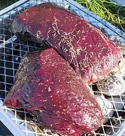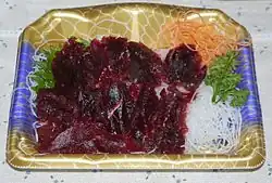 La carne de ballena, en términos generales, puede incluir todos los cetáceos (ballenas, delfines, marsopas) y todas las partes del animal: músculo (carne), órganos (despojos), piel (muktuk) y grasa (grasa de ballena). Hay relativamente poca demanda, en comparación con el ganado de granja, y la caza de ballenas comercial, que ha enfrentado oposición durante décadas, continúa hoy en muy pocos países (principalmente Islandia, Japón, Noruega), aunque la carne de ballena solía consumirse en Europa occidental y Estados Unidos colonial.[1] Sin embargo, dondequiera que exista la caza de delfines y la caza de ballenas aborígenes, los mamíferos marinos se comen localmente como parte de la economía de subsistencia: en las Islas Feroe, en el Ártico circumpolar (los inuit en Canadá y Groenlandia, los pueblos relacionados en Alaska, el pueblo Chukchi de Siberia), otros pueblos indígenas de los Estados Unidos (incluido el pueblo Makah del noroeste del Pacífico), en San Vicente y las Granadinas (principalmente en la isla de Bequia), en un par de aldeas de Indonesia y en ciertas islas del Pacífico Sur.