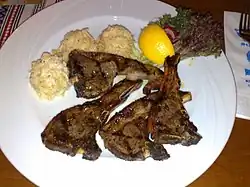 - Cordero lechal: carne de cordero no destetado, normalmente de 4 a 6 semanas de edad y un peso de 5,5 a 8 kg; casi no está disponible en países como Estados Unidos y el Reino Unido. El sabor y la textura del cordero lechal a la parrilla (como las chuletillas de cordero conocidas como chuletillas en España) o asado (lechazo asado o cordero lechal asado) suelen considerarse más finos que los del cordero de más edad y alcanzan precios más altos.[20] Las zonas del norte de España donde se puede encontrar son Asturias, Cantabria, Castilla y León, y La Rioja. Los corderos alimentados con leche son especialmente apreciados para Pascua en Grecia, cuando se asan en un espetón.
