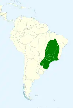 Se distribuye a través del este de Brasil, sur de la Selva Amazónica hasta Río Grande del Sur, Paraguay y (Misiones) Argentina. Se encuentra en varios hábitats del selva húmeda y sabana.