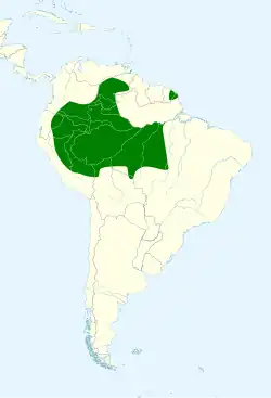Vive en el bosque húmedo, tanto en tierra firme como en áreas estacionalmente inundables de la Amazonia,[3] así como en campos arbolados y tepuyes,[4] por debajo de los 1.200 m de altitud,[5] preferentemente entre los 500[6] y 900 m s. n. m.[4]