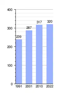 Tras el censo de 2022 se conoció u leve crecimiento de la localidad con 320 habitantes y unas 195 viviendas.[4]Además, el censo dio a conocer datos de su composición poblacional (158 hombres 162 mujeres), densidad y área urbana.[5]