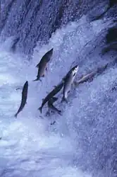 El salmón negocia cascadas y rápidos saltando o brincando. Ellos han sido registrados haciendo saltos verticales tan altos como 3,65 metros (12 pies). La altura que un salmón puede alcanzar por un salmón depende de la posición de la onda estacionaria o salto hidráulico en la base de la caída, así como la profundidad del agua.