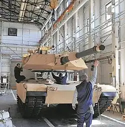 Los mecánicos de Anniston Army Depot alinean una torreta M1 Abrams con su casco.