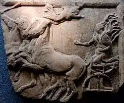 Losa de la tumba con un caballo tirando de un carro con cuatro ruedas radiadas.