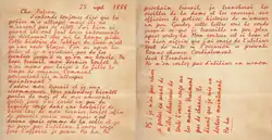 Esa misiva está escrita con tinta roja, y tiene varias faltas de ortografía, así como un post scriptum desarrollado verticalmente.