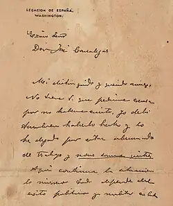 En 1897, Canalejas, de viaje por Estados Unidos, país al que llegó en octubre,[1] efectuó junto al embajador español Dupuy de Lome una visita al presidente estadounidense William McKinley en Washington D. C..[2] Posteriormente se trasladaría a La Habana.[2] Allí, le fue sustraída por Gustavo Escoto, un colaborador de la insurgencia cubana, una misiva privada cuyo remitente era Dupuy de Lome, y que había sido enviada a comienzos de diciembre.[3] En ella Dupuy de Lome le ofrecía su opinión sincera sobre McKinley, donde hacía comentarios muy críticos hacia la capacidad de este como presidente,[4] tildándole de débil, de populachero y de politicastro.[5] La carta fue publicada el 9 de febrero en el New York Journal, propiedad del magnate de la prensa amarilla William Randolph Hearst,[4] refiriéndose a esta como «el peor insulto hecho a los Estados Unidos en toda su historia».[6] La publicaciones sensacionalistas estadounidenses comenzaron a publicar noticias y editoriales contrarios a de Lome y España.[7] De Lome se vería forzado a dimitir como embajador, siendo sustituido por Luis Polo de Bernabé el 10 de marzo de 1898.[8] El escándalo político contribuyó a deteriorar las relaciones entre Estados Unidos y España,[8] y poco más tarde, el 15 de febrero de 1898, la explosión del acorazado Maine en el Puerto de La Habana precipitaría la guerra entre Estados Unidos y España iniciada en abril.
