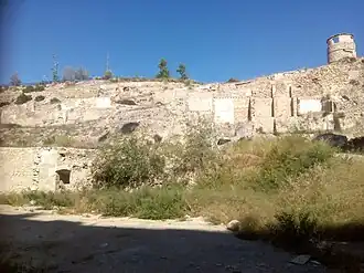 El resto cartaginés más importante es un tramo de una muralla que protegía la ciudad por el este. Esa era la parte que más necesitaba defensa por estar en tierra firme. Esta muralla no era maciza, sino que estaba compuesta de dos muros paralelos que posibilitaban la disposición de alojamientos y de almacenes entre ellos.