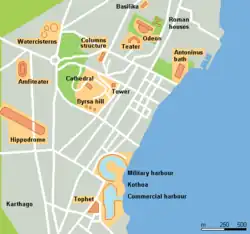 La Cartago Púnica estaba dividida en cuatro áreas residenciales de igual tamaño y con el mismo trazado, tenía áreas religiosas, plazas de mercado, casa del consejo, torres, un teatro y una enorme necrópolis; aproximadamente en el centro de la ciudad se alzaba una alta ciudadela llamada Birsa. Alrededor de Cartago había muros "de gran fortaleza" que se dice que en algunos lugares se elevaban por encima de los 13 m, con casi 10 m de espesor, según autores antiguos. Al oeste, se construyeron tres muros paralelos. Las murallas corrían en total unos 33 kilómetros para rodear la ciudad.[7] Las alturas de Birsa se fortificaron adicionalmente; siendo esta zona la última en sucumbir a los romanos en el 146 a. C. Originalmente, los romanos habían desembarcado su ejército en la franja de tierra que se extendía hacia el sur desde la ciudad.[8]