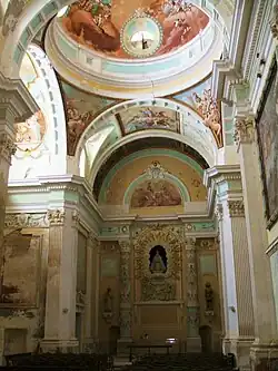 La iglesia, muy espaciosa, presenta planta de cruz latina, con atrio a los pies, nave única de cuatro tramos, transepto poco pronunciado y cabecera plana. La nave se cubre con bóveda de cañón con lunetos sobre ventanas y el crucero con cúpula de media naranja sobre pechinas y con cuatro vanos con forma de óculo, que exteriormente desarrolla cimborrio octogonal.