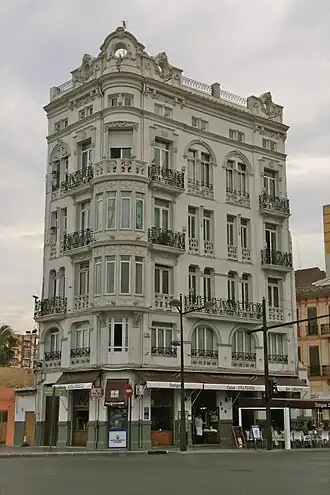 De dimensiones amplias, el edificio consta de planta baja, cuatro alturas y un ático de menores dimensiones. Destaca en su fachada los miradores cuatripartitos de la segunda y tercera altura y la ornamentación floral modernista tanto en la fachada como en las barandillas de los balcones en hierro forjado. Está rematado por un frontón con óculo que realza la fachada, también con decoración floral.