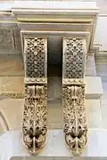 Al descender a la planta baja se puede apreciar una reminiscencia de neoclasicismo en la solución rústica de la puerta. Sin embargo, en las columnas y zapatas del otro extremo de la estructura encontramos la influencia del arquitecto francés Eugène Viollet-le-Duc. La entrada por su parte ostenta dos placas de bronce con las cabezas de las deidades romanas Mercurio y Minerva junto a sus atributos.[2]