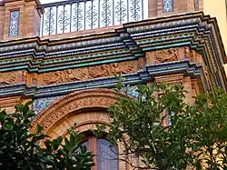 En cuanto a las fachadas, la más notable es la correspondiente a la cara este, que da a la avenida. En ella se encuentra la loggia o pórtico, tanto en planta baja como en alta, a base de arquerías de medio punto en ladrillo cortado y tallado, sobre columnas de mármol de orden compuesto. Lateralmente, encuadran la loggia machones formados por pilastras dobles toscanas sobre pedestales, asimismo en ladrillo. Las enjutas de los arcos y los fustes de estas pilastras se encuentran decorados por azulejos polícromos. Las fachadas de los lados menores del cuerpo rectangular se resuelven por medio de pilastras toscanas en ladrillo, que encuadran arcos semicirculares con las roscas realizadas del mismo material. También las fachadas del cuerpo cuadrangular presentan idéntica decoración. La ornamentación de los jardines alrededor de la casa se conserva con escasos cambios respecto al proyecto original. La zona más vistosa es la correspondiente a la loggia. Aquí se coloca, como elemento principal, una fuentecilla de planta estrellada, rodeada por bancos.[1]