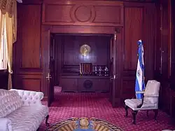 El segundo y actual Palacio Nacional sería inaugurado en 1911, teniendo el mandatario su propia oficina conocida como Salón Amarillo, además del salón rojo donde se presentaban las credenciales de los embajadores hasta la administración del General Maximiliano Hernández Martínez.[9]