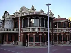 Es de reseñar también la valla que cierra el jardín por la Avenida de Cataluña, que presenta similitudes estilísticas con la fachada principal del edificio, con pilastras de ladrillo rematadas por florones más pequeños que los que existieron en el edificio, e interesante puerta de cerrajería.[1]