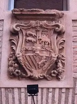 El escudo se encuentra presidiendo la Torre e incluye varios símbolos de la familia Ramírez de Carrión; también se representa en él la fauna menor de la zona, como por ejemplo la mula, y el topo; y la flora, con moreras e higueras.. Lleva una serie de orlas, frutas: naranjas, limones, granadas, flores, membrillos. En la parte superior está coronado por la cruz de Calatrava, ya que los ancestros de esta familia pertenecían a esta orden.