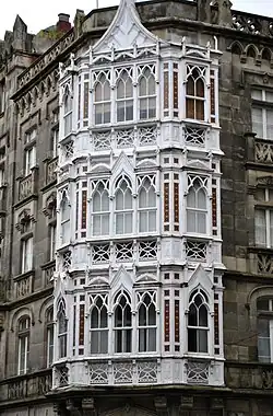 El edificio, construido en cantería muy cuidada de granito gallego, es de estilo historicista similar a los pazos góticos urbanos del siglo XV. Destaca la galería de madera de su chaflán neogótico en donde se combinan diferentes elementos de ese estilo. Cuenta también con orlas verticales de cerámica esmaltadas en tonos dorados.[6]
