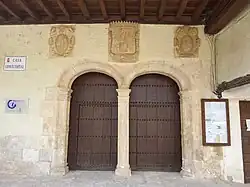 Detalle de las puertas de acceso con los escudos de armas en la parte superior.