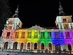 Fachada principal iluminada con los colores del arcoíris durante el mes del orgullo de 2023