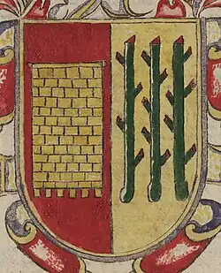 - En plata, tres bastones de azur. Existen distintas variantes de esmaltes según las familias que lo ostenten, como en oro con tres bastones de sinople, en campo azur con tres bastones de oro, o en plata con tres bastones de gules;