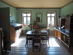 - Primer piso: también visto desde la plaza Frauenplan, se encuentran en la parte occidental derecha del ala posterior el estudio de Goethe con su antesala, que albergaba, al mismo tiempo, parte de su colección de minerales, su biblioteca privada con 5.424 títulos en unos 7.000 volúmenes, su dormitorio y la sala de escritura. La parte oriental (izquierda) de la casa trasera alberga la habitación de Christiane. Todas estas habitaciones tienen vistas al jardín.