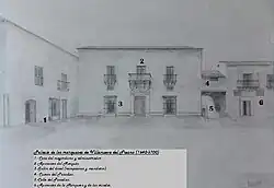 El edificio era de dos plantas, salvo las bodegas y caballerizas que contaban sólo con una, como era habitual en este tipo de construcciones que aparecía en el casco urbano. Las dependencias principales estaban distribuidas en tomo a un patio con corredores. Contaba con una veintena de habitaciones de diferentes dimensiones: el cuarto de la galería, el cuarto del pasadizo, el cuarto del balcón, que daba hacia la plaza, el cuarto del fuego (cuya denominación indica que este espacio debía contar con chimenea), el cuarto de las mujeres, donde se encontraba el archivo de la casa, el cuarto de los pajes, el cuarto de la viga, el cuarto del corredor, donde estaba la biblioteca, el cuarto del dosel, el cuarto hondo, el cuarto de la sala del trueque, donde eran atendidos los negocios del señor, el cuarto principal del jardín, y un número indeterminado de aposentos, todos ellos destinados a habitaciones.