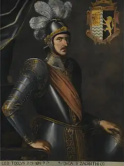 Retrato de «Leo Toccus, duque de Zacinto», siglo XVI. La pintura representa ya sea a Leonardo II Tocco, conde palatino de Zacinto, o Leonardo III Tocco, déspota de Epiro y conde palatino de Cefalonia y Zacinto.